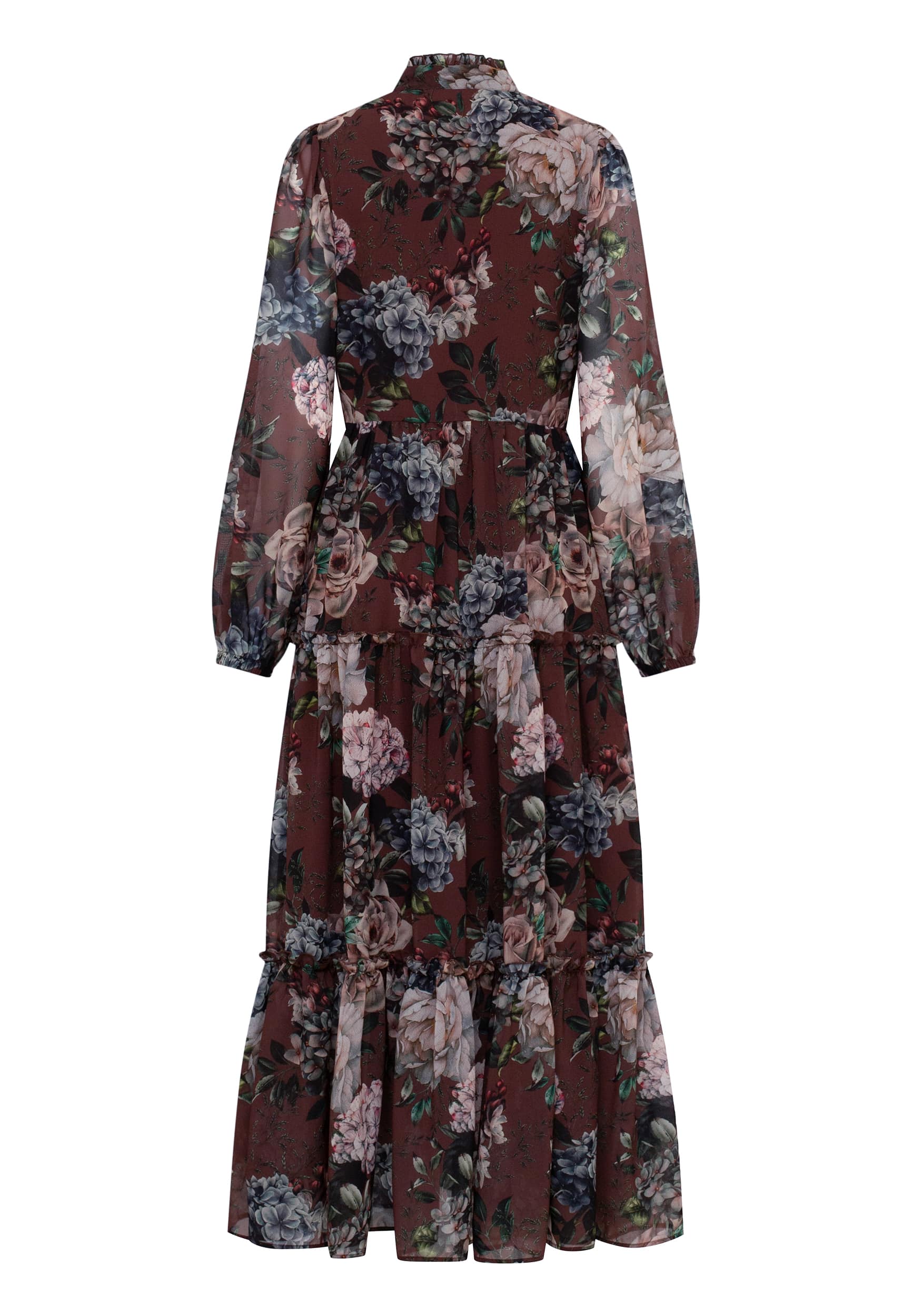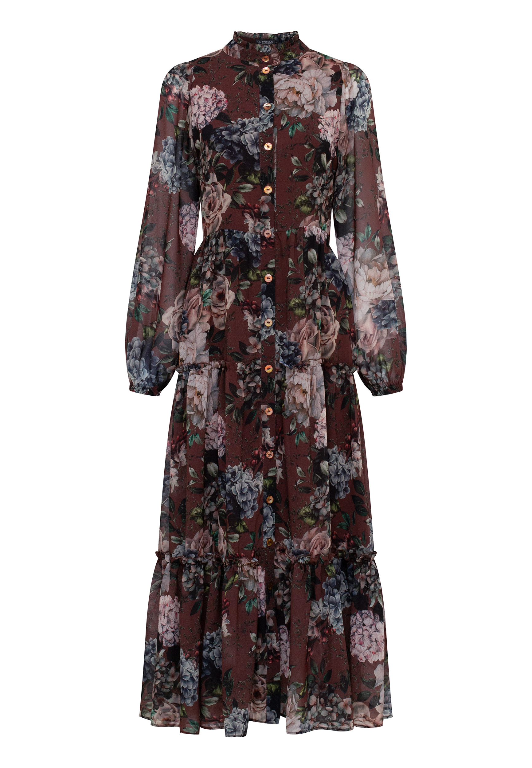- Модель на пуговицах со сквозной застежкой, развевающейся юбкой и пышным рукавом